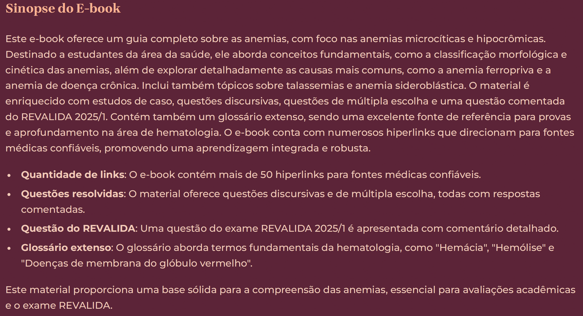 Anemias - Abordagem Geral e Anemias Microcíticas e Hipercrômicas finaliza os e-books sobre Hematologia. Ideal para estudantes da área da saúde! Com conteúdo claro e didático sobre anemias ferropriva, doença crônica, talassemias e mais, o material inclui